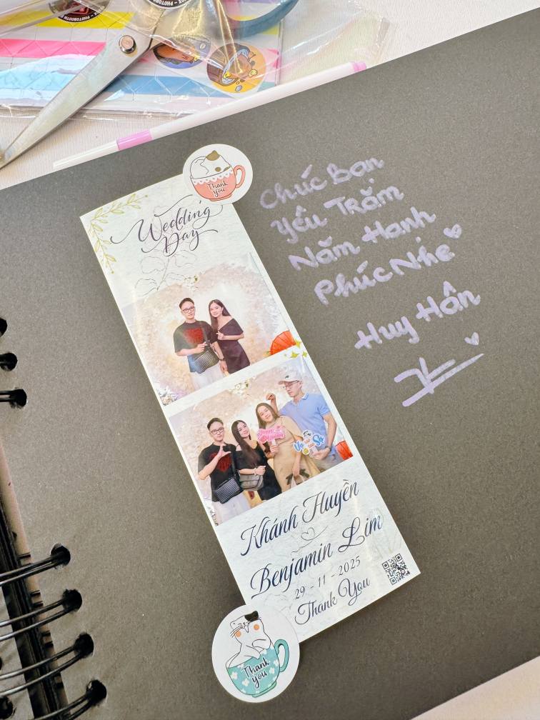 Buổi tiệc trở nên sôi động hơn khi khách mời thích thú tạo dáng cùng photobooth lấy liền 9XBox. Những tấm ảnh filmstrip đáng yêu, sắc nét, được in ngay tại chỗ đã giúp mọi người ghi dấu lại khoảnh khắc vui vẻ bên cô dâu – chú rể.