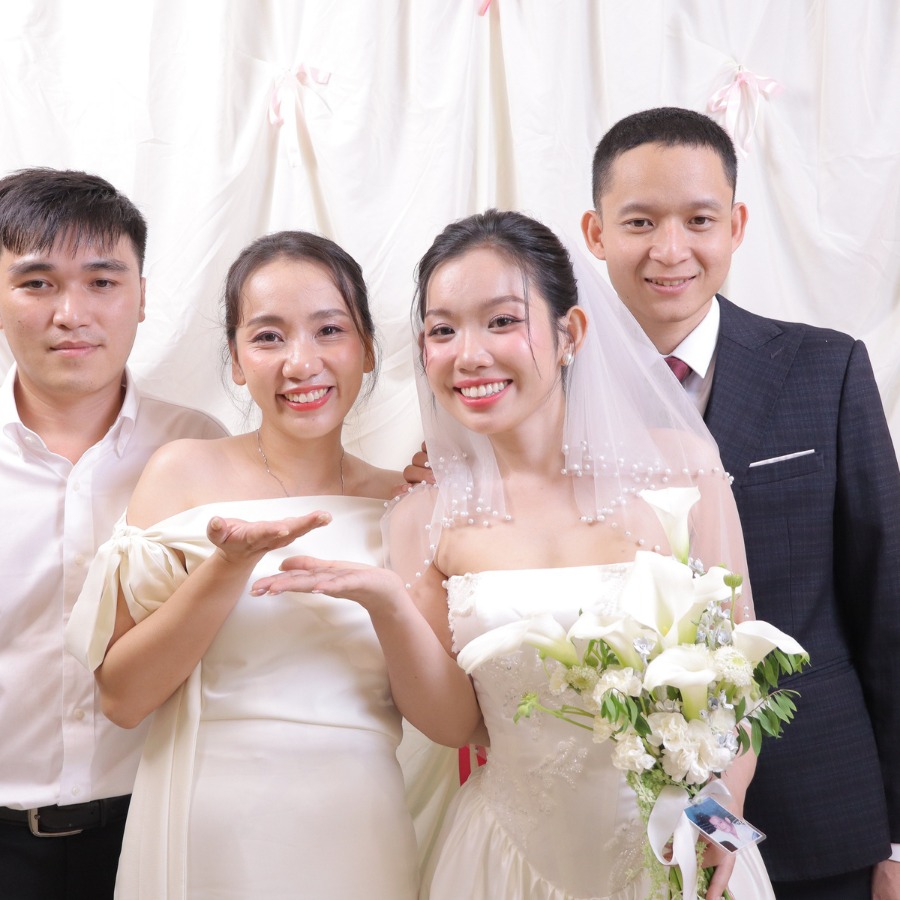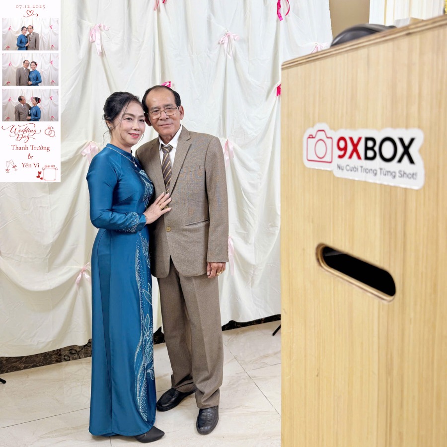 Một trong những điểm thu hút nhất của buổi tiệc chính là góc Photobooth 9xBOX – nơi bạn bè của cô dâu chú rể đã thoải mái tạo dáng, cười đùa và lưu lại những khung hình kỷ niệm. Không khí vui tươi lan toả qua từng nụ cười tự nhiên, ai cũng háo hức ghi lại dấu ấn trong ngày trọng đại của đôi bạn.